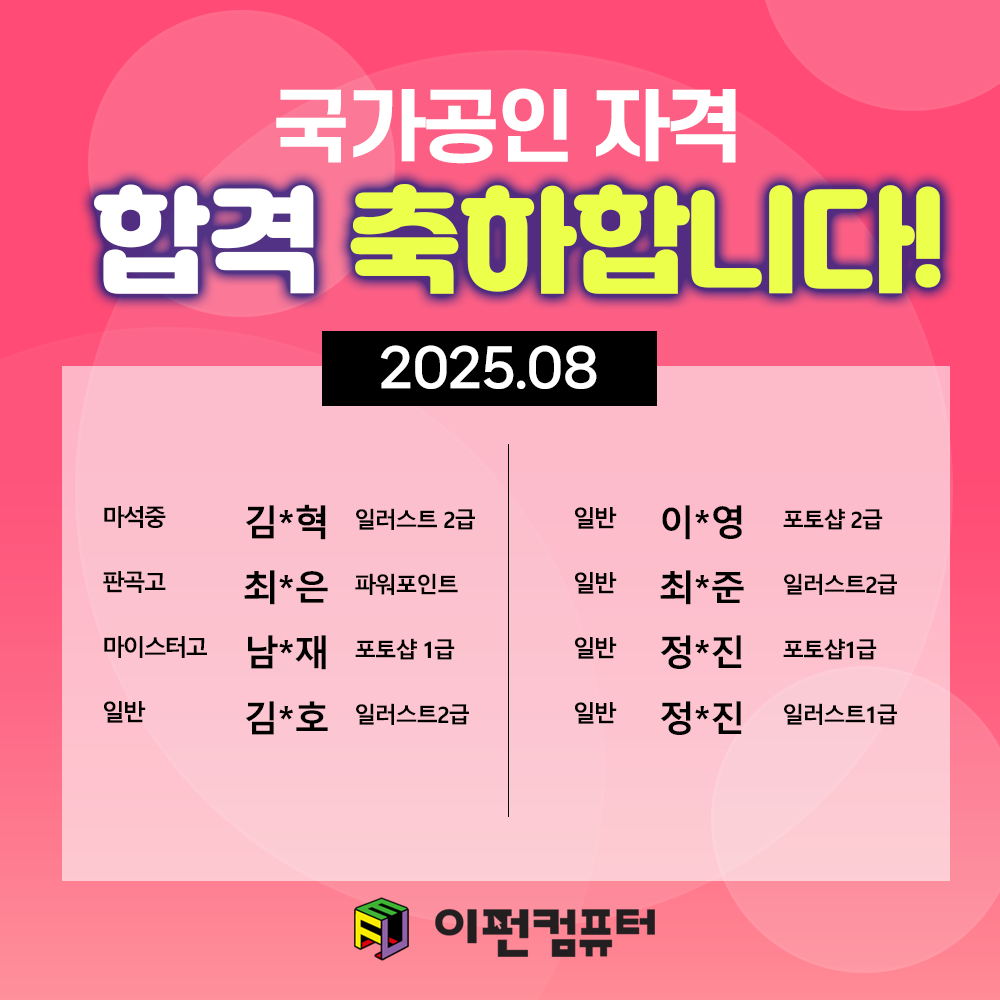 | [만점합격자★] 자격증 합격을 축하합니다. (0) | 2025.10.30 |