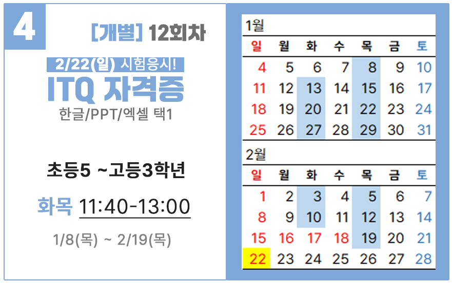 | 프로그램 : 파워포인트/엑셀/한글 (택1) | 대상 : 초등 5학년 - 고등 3학년 | 기간 : 1/8(목) ~ 2/19(목) | 화목 11:40 ~ 13:00