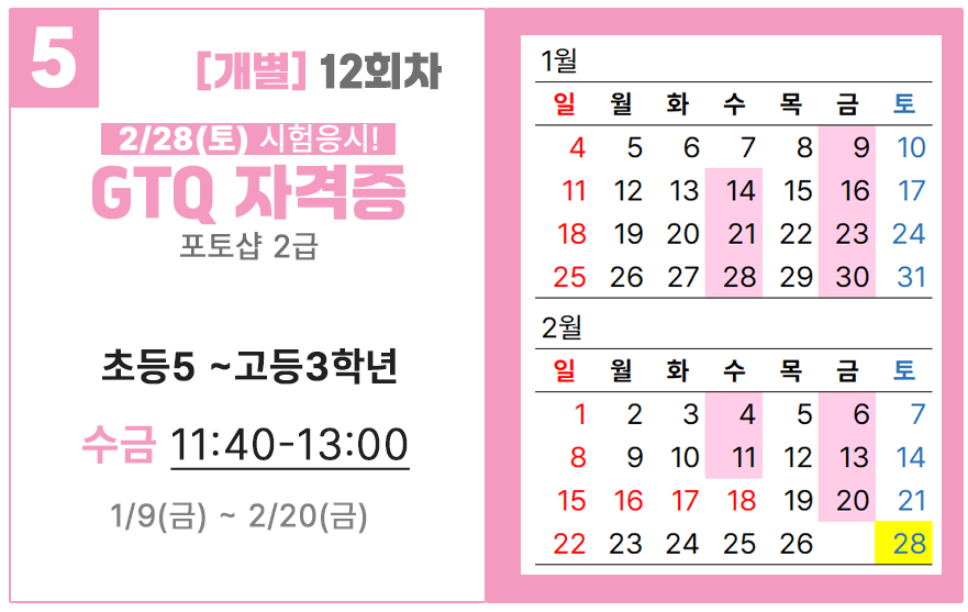 | 프로그램 : 포토샵 | 대상 : 초등 5학년 - 고등 3학년 | 기간 : 1/9(금) ~ 2/20(금) | 수금 11:40 ~ 13:00