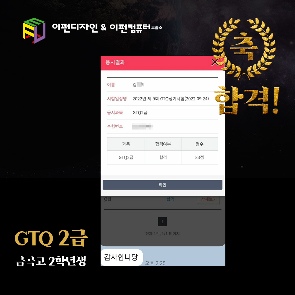그래픽 관련 자격증을 취득하고 싶어서 저희 교습소를 찾아왔었는데요. 본인이 재미있어하고 성실하게 해줘서 GTQ 포토샵 2급을 단번에 합격하였습니다. 현재 GTQ포토샵 1급은 물론, 일러스트 GTQi 시험까지 길게 목표잡고 진행중입니다.