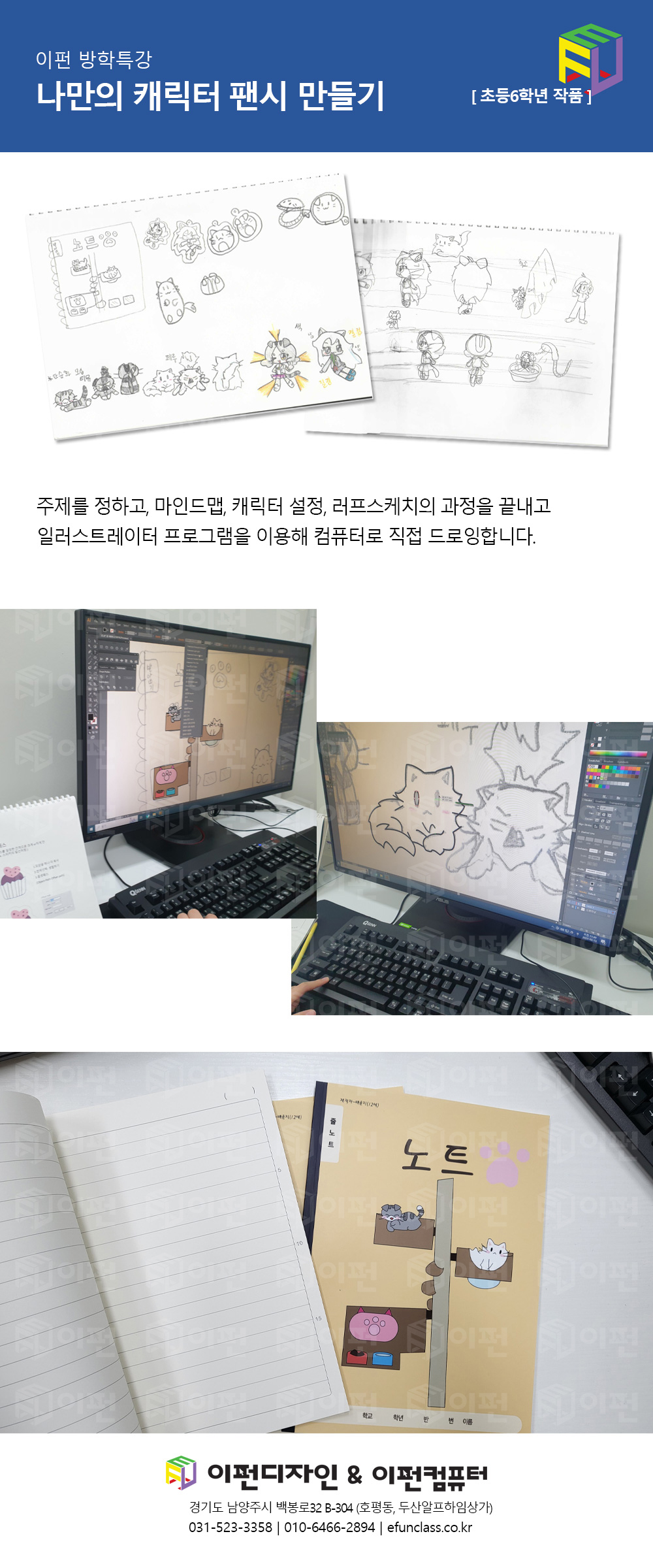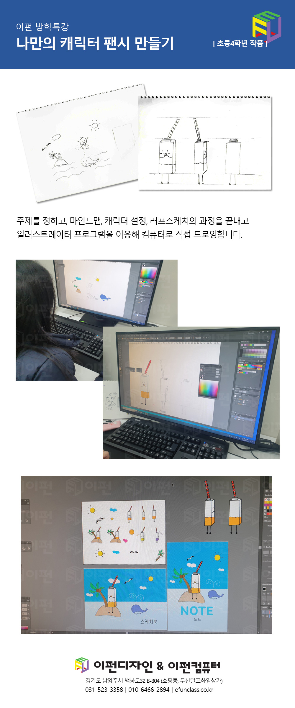 일러스트를 이용한 "나만의 캐릭터 팬시 만들기"는 4회로 진행되어 드로잉에 대하여 깊이 배우지는 못하고 팬시까지 만들어지는 과정을 경험해보는 시간이었습니다. 다소 짧았던 진행기간이 아쉬워, 다음에는 정규과정으로 편성해도 좋겠다는 생각을 하였습니다.