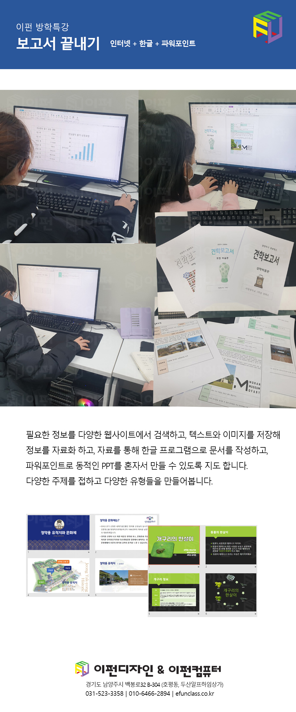 보고서끝내기는 인터넷을 활용하여 다양한 자료를 검색하고, 저장하며 정보화하고, 한글프로그램과 파워포인트 프로그램을 다루어 혼자서도 문서나 PPT 등을 만들 수 있도록 연습하였습니다. 남양주시의 관광명소나, 정약용문화제등의 다양한 주제들로 컴퓨터와 조금이나마 친해지는 시간이었습니다.