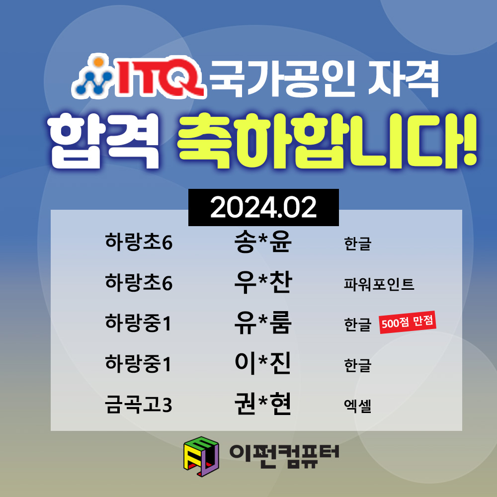 특히, ITQ한글에서 500점 만점자가 나왔답니다.